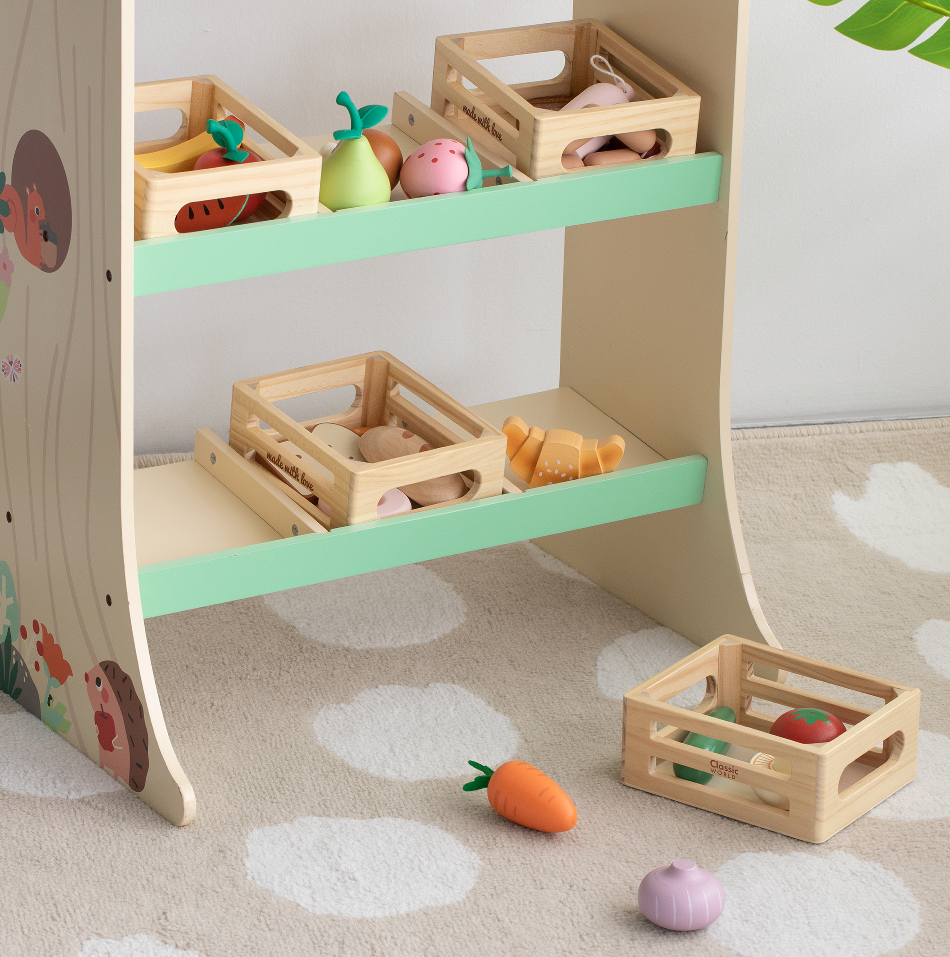 Este juguete ayuda a los niños a aprender colores y verduras mientras se divierten, estimulando sus habilidades cognitivas. Al final del juego, pueden guardar las verduras en la caja de madera, fomentando hábitos de orden y organización.