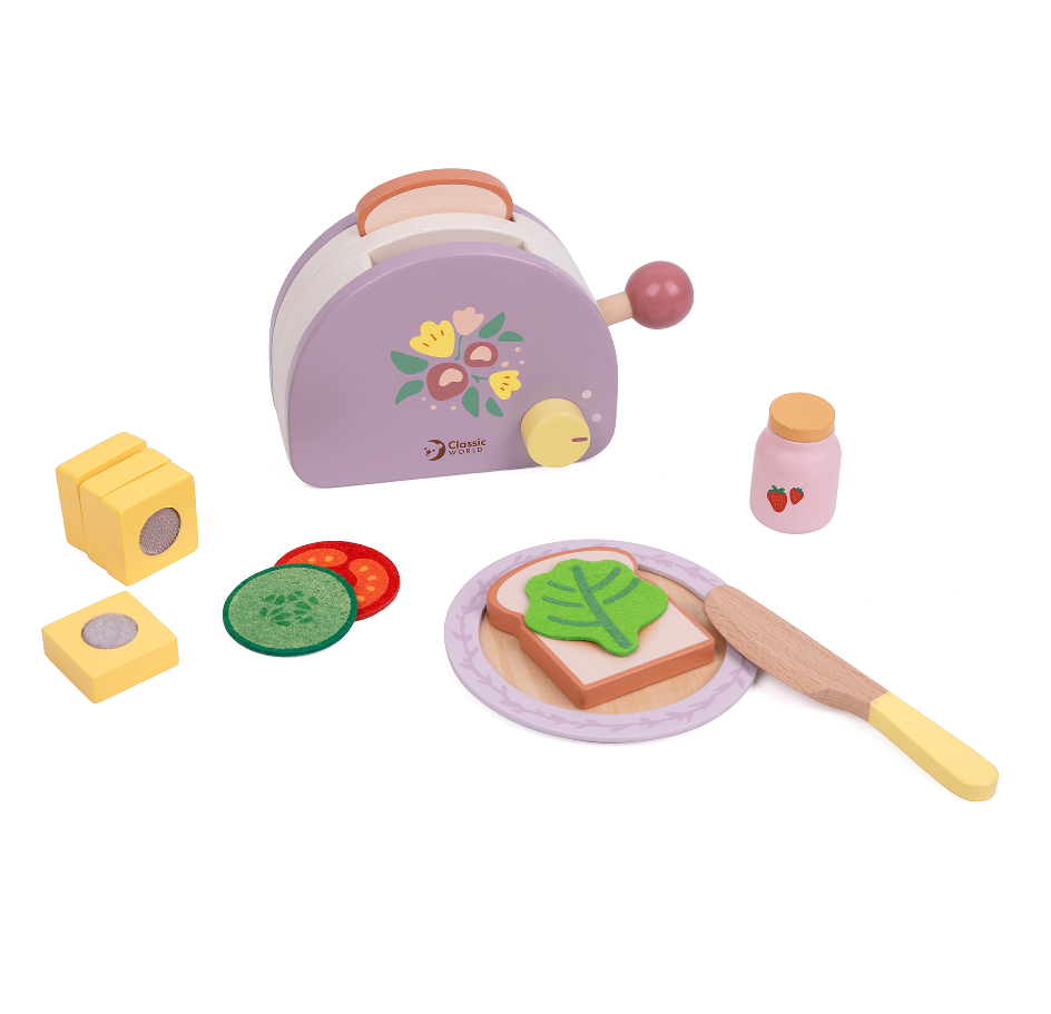 ¡El desayuno es la comida más importante del día! Fomenta hábitos saludables con este divertido set, que incluye tostadora, platos con mantequilla, cuchillos de madera y jugos. Perfecto para estimular la creatividad y el juego imaginativo de los niños.